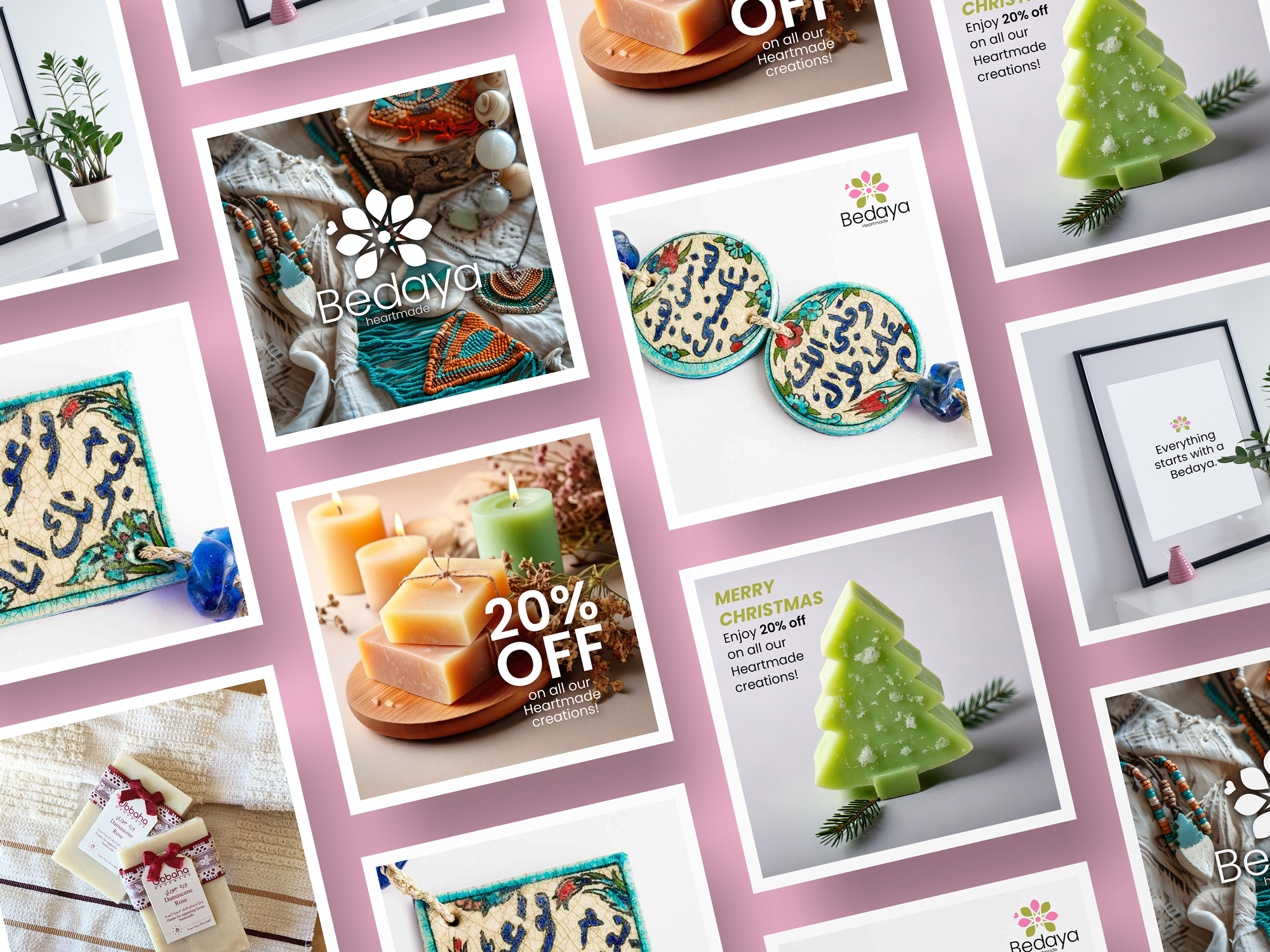 I designed the logo and social media visuals for Bedaya, an online shop based in Dubai that sells handcrafted products. The visual style is modern and elegant, reflecting the brand’s artisanal spirit.