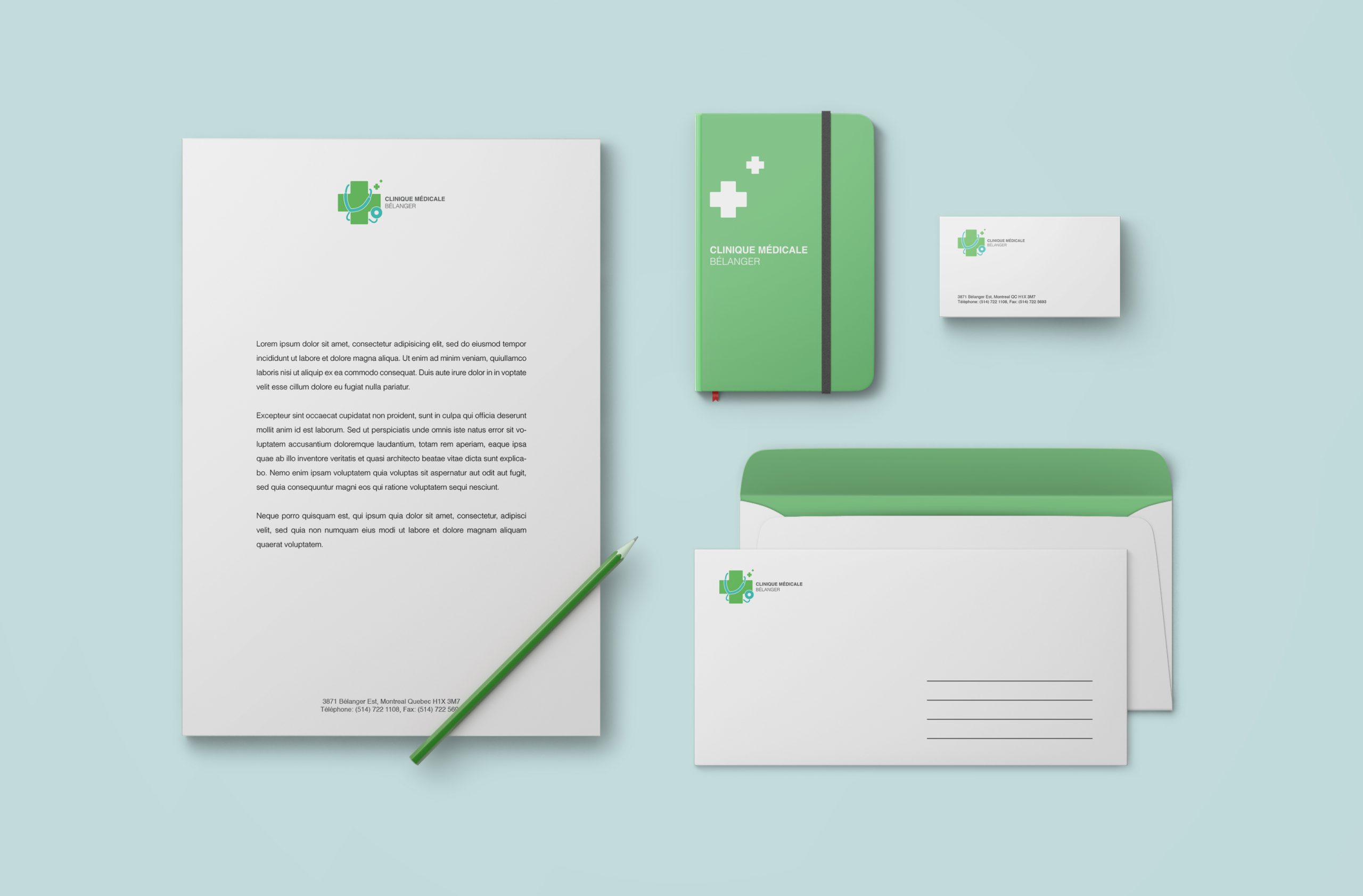 I designed the logo and stationery for Clinique Médicale Bélanger, a medical clinic and pharmacy in Montreal. The visual identity is modern and professional, unifying both healthcare and pharmaceutical services under one cohesive brand.